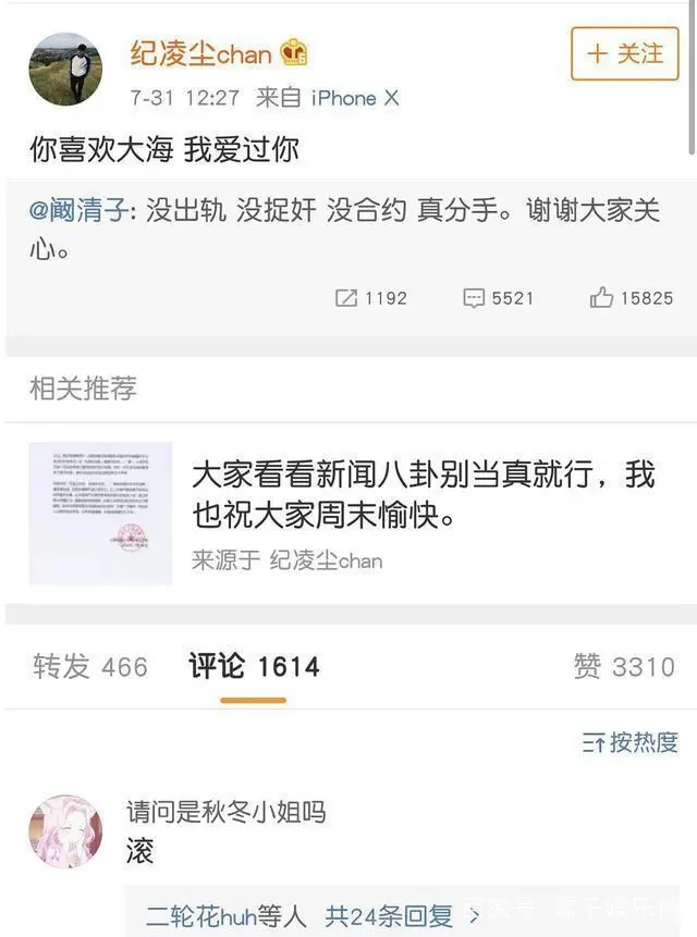 不过看到阚清子如今这么幸福,而纪凌尘自从和阚清子分手以后,事业一落千丈,自然大家还是很关心两人当初为什么分手?关于分手的原因,有不同的说法,有说是纪凌尘劈腿,被阚清子捉奸在床了,还有说两人是合约情侣,当初就是为了录制《亲爱的客栈》假装情侣的,但对这一系列传闻,阚清子发文表示“没出轨 没捉奸 没合约 真分手。谢谢大家关心。”随后纪凌尘转发此条微博称:“你喜欢大海,我爱过你。”后来纪凌尘的这句话成为了渣男语录,在一起这么就,居然就用描淡写的“爱过”就带过了。