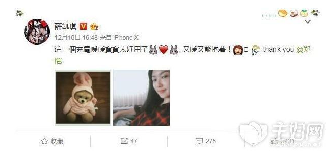薛凯琪的微博内容是:這一個充電暖暖寶寶太好用了, 又暖又能抱著!thank you !最后还不忘艾特郑恺,配上了一组照片,照片中的小白兔暖手宝,是郑恺自创品牌的产品,应该和郑恺认识合作过的艺人都有收到,不过只有薛凯琪的这篇微博让人产生了遐想!
