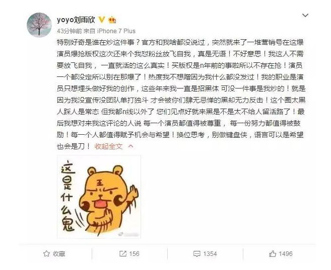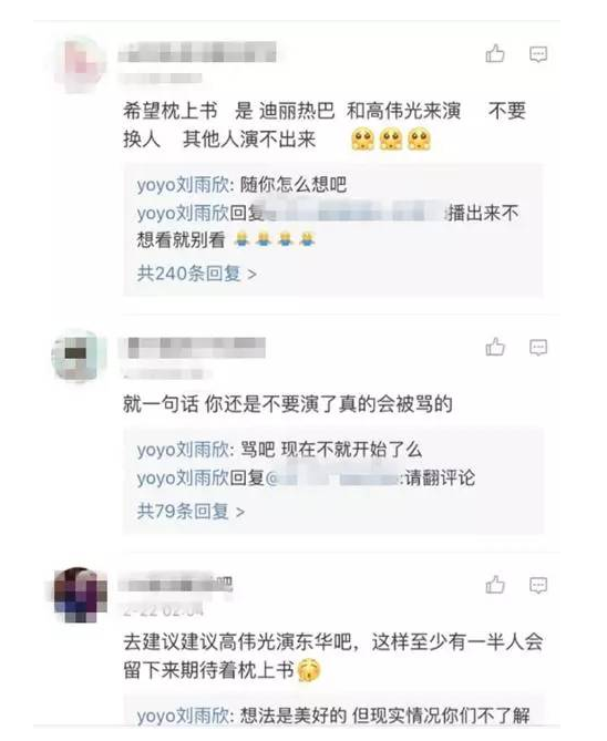 整件事情的经过,刘雨欣也通过微博回应了,并且在《枕上书》定下男女主角官宣之后,刘玥霏还转发了微博,表示自己只剩下一个心愿,就是“尊重原著”。原本自己买下版权,是想自己去诠释剧中的角色,但最终却是出演了,但只换来了姬蘅一角。