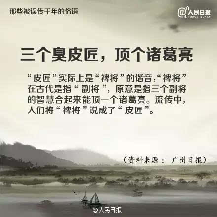“皮匠”实际上是“裨将”的谐音,“裨将”在古代是指“副将”,原意是指三个副将的智慧合起来能顶一个诸葛亮。也不知道是谁在口口相传的时候发音不准,愣是将“裨将”说成了“皮匠”。