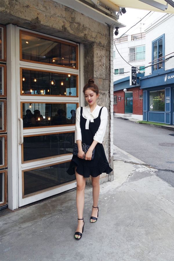 黑色背心裙内搭白色七分袖雪纺衫,裙摆花边非常甜美俏皮,搭配一双黑色高跟凉鞋和黑色包包,经典的黑白配色简约时尚。
