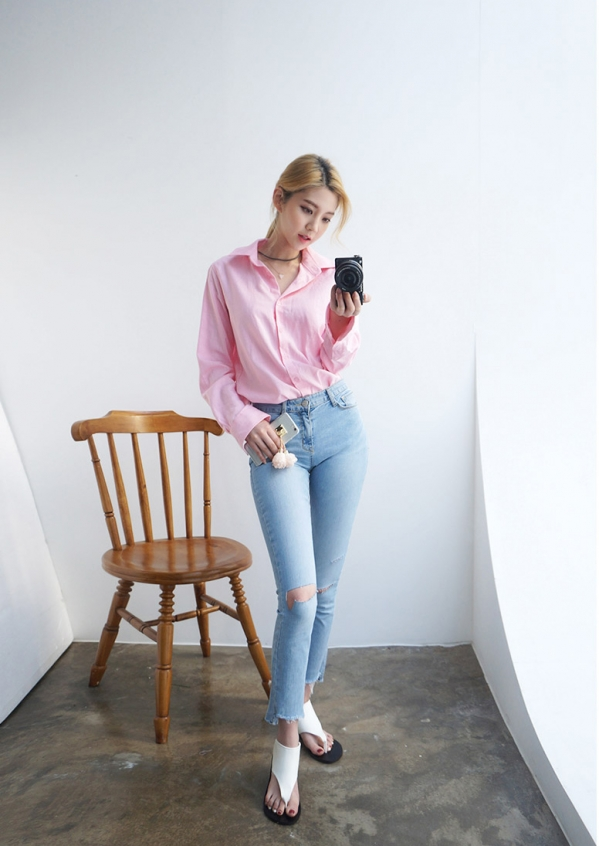 破洞牛仔长裤深受年轻人的喜爱,紧身的版型显高显瘦还十分性感。浅粉色衬衫搭配浅蓝色破洞牛仔裤,甜美又青春时尚。