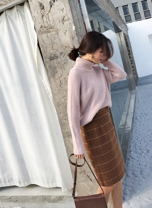 半身直筒裙性感优雅,女人味十足又不失成熟干练气质,棕色格纹半身直筒裙,成熟优雅又时髦,搭配粉色针织衫,多了几分温柔和甜美,整体搭配优雅又充满女人味。