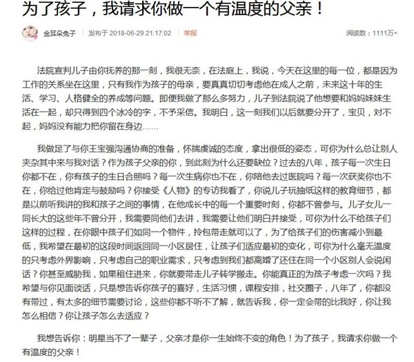 最后马蓉写道我想告诉你:明星当不了一辈子,父亲才是你一生始终不变的角色!为了孩子,我请求你做一个有温度的父亲!