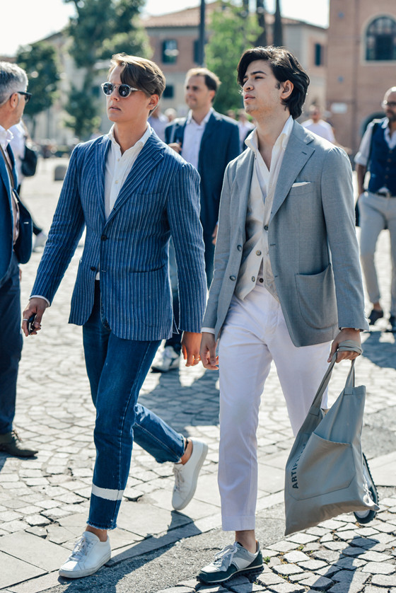 蓝色西装外套内搭白色衬衫,下身搭配蓝色牛仔裤和白色休闲鞋,整身搭配清爽利落,既稳重干练又充满时尚休闲气息。