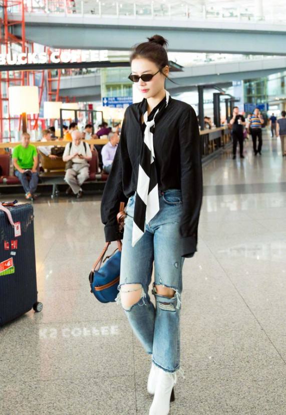 马思纯这套搭配看起来就很干练,破洞毛边牛仔裤配上小白靴,看起来特别像霸道女总裁了。