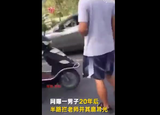 在2018年的12月19日,一则关于“男子20年后拦住老师回报耳光”的长达1分钟09秒的视频在网上疯传,其实该老师被打的时候是在18年的7月份,事发是当天下午的四点钟,被打老师骑着电动车从当地赶往县城,但是就在去的途中路边停着一辆绿色的越野车,旁边站着两个年轻人,其中一个男子就拦住了被打老师,拦住被打老师之后该男子就直接掌掴他,并且说道:“还记不记得我,以前那时候咋削(怎么打)的我还记得不?”等等,据被打老师回忆不仅被扇耳光,还被拳打脚踢,谩骂长达20分钟。