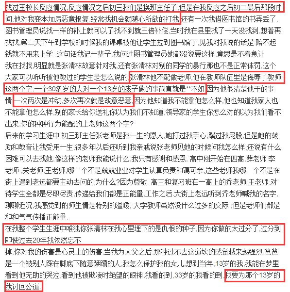 在第二天早上到学校没有完成的同学一个个的站在讲台上并且接受她的体罚,让其他的学生从竹林中找来竹子来体罚没有完成作业的学生,小编还记得有一个同学眉毛处都被打破皮出血,但是这位老师并没有被学校开除而是安稳的教书一直到退休,这对于小编来说是一辈子的阴影,好在之后小编就转学了再也没有遇到过类似的老师。