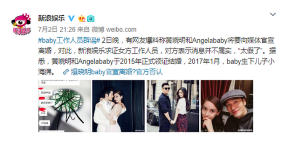 不得不说这一些列的操作网友们都表示真的似曾相识啊,这和当年传了那么多年杨幂和刘恺威离婚的剧情完全是一模一样啊,就在近日黄晓明和杨颖再次被传出已经在青岛民政局领取了离婚证,还称很快就要宣布这个消息,但是作为当事人的杨颖工作室第一时间回应:“太假了。”虽然一次次被传出离婚,但是一次次都是被否认。