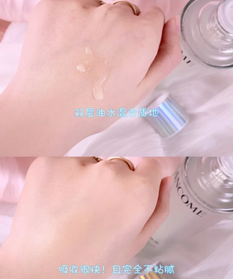 兰蔻极光水是兰蔻最新推出的一款精华水,质地不像精华一样粘稠,成分不像化妆水那样的单一,质地是双层水油混合,肉眼可见的微气泡,不油腻,是一款针对混油皮、毛孔粗大、皮肤暗沉无光泽、闭口粉刺等多种肌肤问题的精华液,能够调节肌肤水油平衡,提亮肤色,号称是混油皮的本命神仙水。