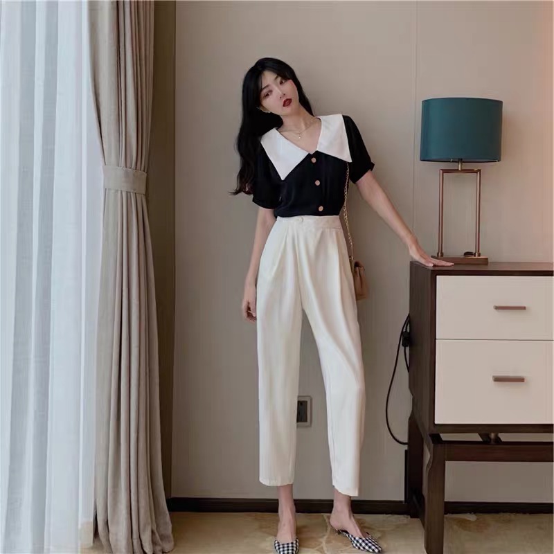 黑色的大娃娃领上衣加扣子的装饰,让这件上衣更多的是气质优雅,娃娃领的设计添加了一点活泼的味道,搭配职场必备的哈伦裤,能够遮胯还显气质,是一个适合30岁左右的职场女性必备的穿搭。