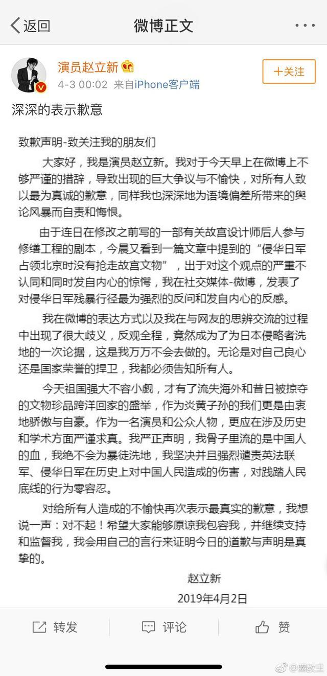 对于赵立新的道歉很多人表示不接受,毕竟我们的祖先圣人孔子就告诫说:君子讷于言而慎于行。古人都知道的道理为什么作为资深学者的赵立新却不知道,扭曲历史,强行洗白罪恶民族这是中国好儿孙吗?作为一个华夏子孙难道不应该铭记历史耻辱,自强不息吗?更何况孔子曰:一言兴邦,一言丧邦。有时候,关键人物的一句话能影响全局,甚至关乎到国运。赵立新是一位知名演员,有很多粉丝,按说他的言行不得不谨慎些才是!