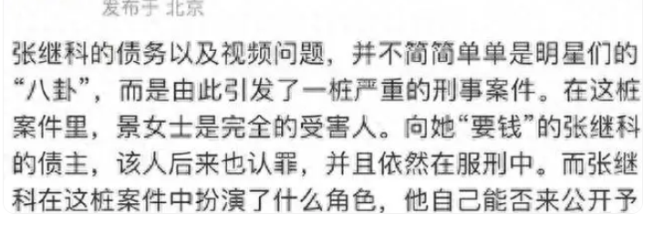 2023年3月31日,微博用户“李微敖”发布微博称,他从几年前看到并掌握的部分司法材料得知,“张继科将景女士的私人视频,传给他人,此情况属实。张继科针对“多个网络平台流传张继科存在债务纠纷”一事,张继科工作室官方微博发布声明称,张继科无任何债务纠纷,更不存在损害他人隐私以求自保之情况,谣传内容纯属捏造。