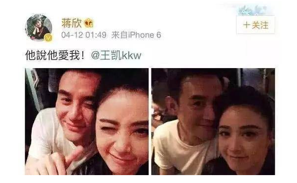 并且之前蒋欣的确是发过饱受争议的微博,而且是在两人合作的电视剧《欢乐颂》播出期间,蒋欣晒出了和王凯的亲密照,照片中王凯用手环住了蒋欣,并且用脸贴在蒋欣的脸上,另外蒋欣还附问:“他说他爱我!”还艾特了王凯,当时很多网友看到蒋欣的这条微博之后,都以为两人是官宣恋情,这大概也是为什么,现在搜索王凯,会出现“王凯承认蒋欣怀孕恋情”这样的词条的原因。 不过在发完这条微博之后,两人并没有什么动静,吃瓜群众一直等着官宣,等着两人宣布结婚的好消息,但一直没有等来,后来大家只能认为两人只是私下关系很好,发那样的文章,并不是官宣恋情,只是关系好到一定程度,好朋友之间的互动而已。