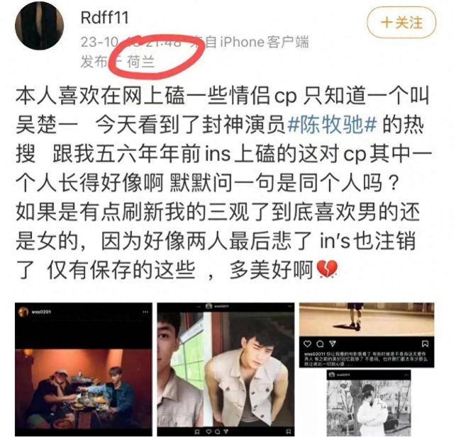 之后就有网友还发现爆料者的账号ip地址定位在荷兰,而吴楚一在第一时间回应的账号ip也在荷兰,且这两人的手机型号还是同一款;再加上这些亲密合照看起来不像是p的,就有人认为吴楚一的这波澄清与陈牧驰亲密合照会不会是自导自演。