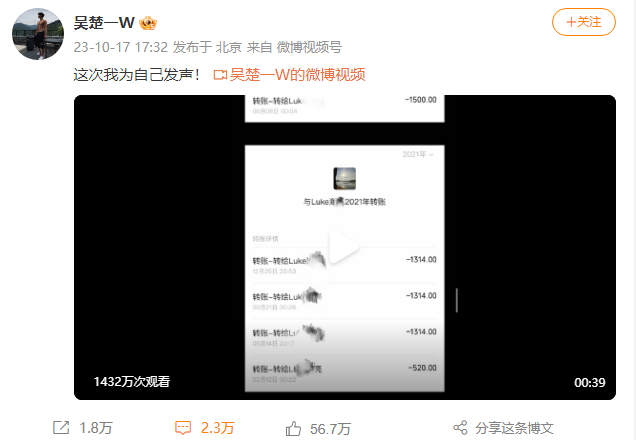 最终在10月17日的时候,吴楚一再次发文称:这次我为自己发声!并附上了相关视频,在视频中可以发现吴楚一晒出了他与陈牧驰及其律师的聊天记录。其中还透露原本定好的面谈被取消:“我还在把你当家人,你却把我当敌人。”还爆料陈牧驰曾开车撞墙,自己帮他背锅。且还能发现其曾经给陈牧驰进行了多次转账,其中还包含几笔“1314”、“520”的转账。