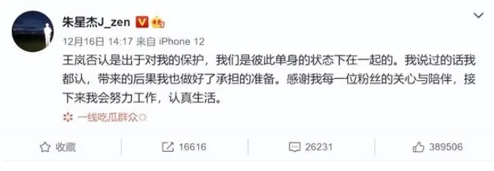 舆论发酵后,王岚也坚决否认出轨一说,但是因为这件事曝光发生没多久,王岚就和魏哲鸣离婚了,前脚王岚否认出轨,后脚朱星杰的社交媒体沦陷,实在没办法,他站出来承认了与王岚的恋情,还表示王岚之所以否认是因为对自己的保护才否认和自己在一起,还表示两人在一起的时候都是单身的状态,不存在出轨劈腿,但是对此网友并不买账,但是作为十八线的艺人,这件事情也就不了了之了。