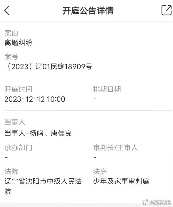 虽然在当时该事件被传的沸沸扬扬,但是杨鸣和唐佳良两人的婚姻还未有离婚的征兆,直至此次离婚案即将开庭的消息在网络上传开之后,才发现杨鸣曾因离婚纠纷起诉唐佳良,该案已于2023年2月在沈阳市沈河区人民法院开庭。