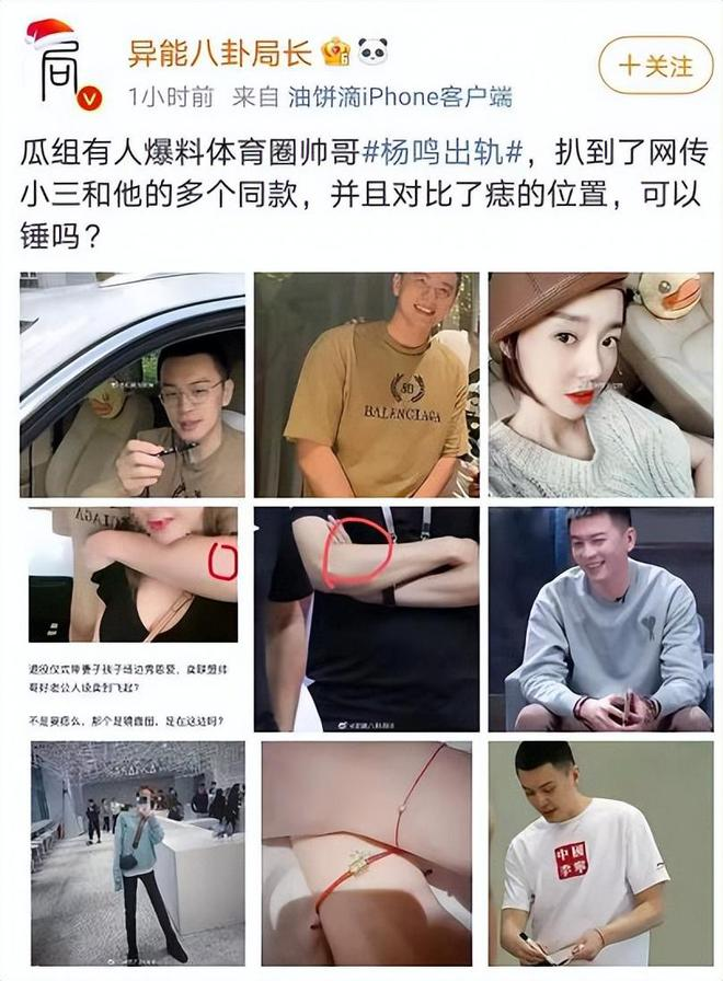 同时另一张照片是一位男子胳膊搂着她本人的脖子,而这位男子穿的衣服和汽车里的杨鸣一样,同时胳膊上还有一个不算明显的小黑痣。因此网友对比了两张照片,确认此人搂着思思的男子就是杨鸣。即便是这些照片后来被删除,但依旧引起轩然大波。
