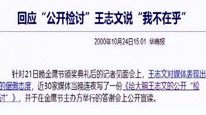 只不过在该文章发布出来后,很多网友都看见整篇文章里面写的语句,都是在讽刺王志文红了就开始耍大牌,如果没有记者们的帮助,他现在也就是一个不知名的小演员。如此也是引发了不小的舆论,而在之后的采访中,王志文也是看了那篇文章,最后直接说出一句“我不在乎”。随后转身离开,当时《天道》这部电视剧上映之后,反而给王志文做了一波免费的宣传。